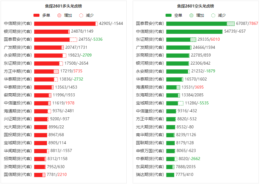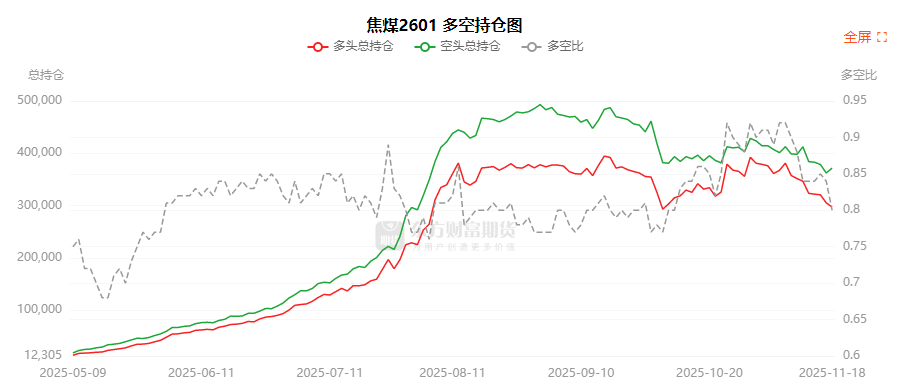 总体而言,焦煤2601合约今日增仓下行,多空持仓排名前20席中,多方呈退场态势,空方呈进场态势。